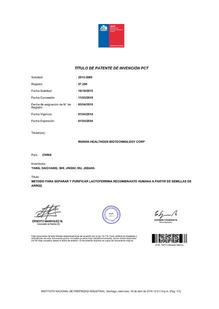 Стандарт:Patent Номер:2015-3069 Дата выдачи:2019-04-05 Выпущен К:Chilean Patent Office |